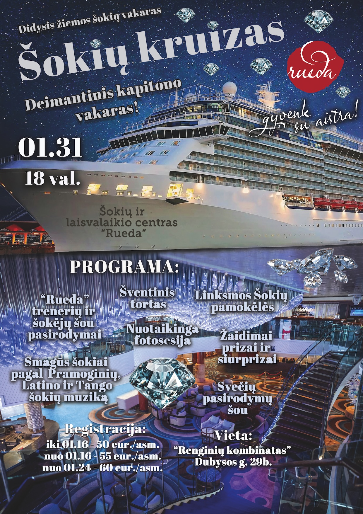 Kviečiame registruotis į Didyjį žiemos šokių vakarą! Vakaro tema Šokių kruizas – Deimantis kapitono vakaras! Sausio 31 d. 18 val.! Registruotis galite čia: REGISTRUOTIS